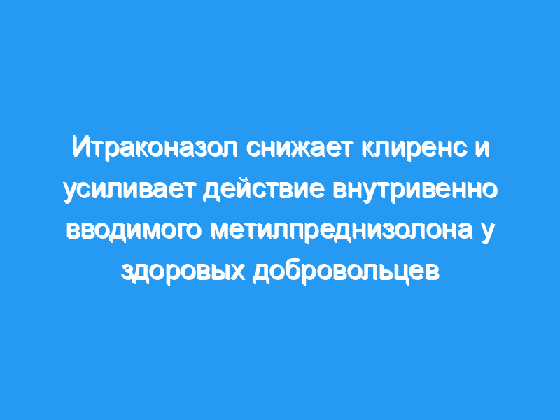 утренняя концентрация кортизола в плазме крови во время фазы итраконазола, измеренная через 24 часа после введения метилпреднизолона, составляла всего около 9% от таковой во время фазы плацебо (11,0+/-9,0 нг/мл против 117+/-49,2 нг/мл, P<,0,001). В заключение следует отметить, что итраконазол снижает клиренс и увеличивает период полувыведения метилпреднизолона, вводимого внутривенно, что приводит к значительному увеличению экспозиции метилпреднизолона в ночное время и усилению супрессии надпочечников.