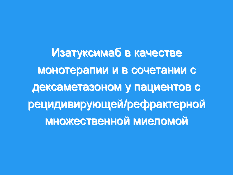 В этом исследовании фазы 2 оценивался изатуксимаб в качестве монотерапии или в сочетании с дексаметазоном при рецидивирующей/рефрактерной множественной миеломе (RRMM). Пациенты имели RRMM, невосприимчивые к иммуномодулирующему препарату (IMiD) и ингибитору протеасом (PI), или получали ≥3 предыдущих линий терапии, включающих IMiD и PI. Пациенты получали изатуксимаб либо в качестве монотерапии (20 мг/кг в дни 1, 8, 15 и 22 [один раз в неделю] цикла 1, затем 20 мг/кг в дни 1 и 15 последующих циклов, группа Isa), либо в комбинации с дексаметазоном (40 мг/сут [20 мг/d у пациентов в возрасте ≥75 лет] один раз в неделю, группа Isa-dex). Пролеченные пациенты (N = 164) получали в среднем 4 (диапазон 2-10) линии предшествующего лечения.