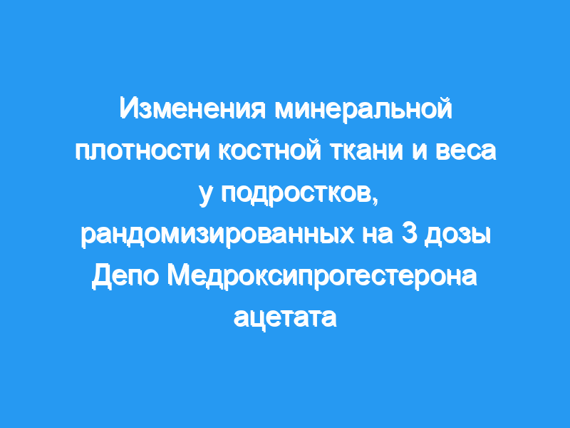 Набор проводился в общинах общего профиля и амбулаторных клиниках в центральном Огайо. Участники: Самостоятельно направленная выборка из 34 девочек-подростков в возрасте 12-21 года, принимавших депо медроксипрогестерона ацетат (DMPA). Вмешательства: Рандомизация до 1 из 3 доз ДМПА (150, 104 или 75 мг), вводимых внутримышечно каждые 12 недель в течение 48 недель. Основные показатели результатов: Абсолютное и процентное изменение МПКТ с 0-48 недель в поясничном отделе позвоночника L1-L4, всего бедра и шейки бедра, абсолютное и процентное изменение веса через 48 недель.
