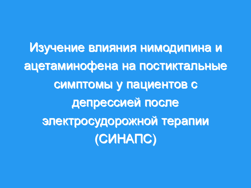 В рамках этого клинического исследования мы будем систематически изучать постиктальную ЭЭГ, МРТ и клинические явления после вызванных ЭСТ судорог, а также протестируем эффекты сосудорасширяющего лечения, направленного на уменьшение постиктальных симптомов. Если будет установлен эффект, это обеспечит новое лечение постиктальных симптомов у пациентов с ЭСТ. В конечном счете, эти результаты могут быть обобщены на пациентов с эпилепсией. Пробная регистрация: Включение в SYNAPSE началось в декабре 2019 года. Регистрационный номер проспективного исследования — NCT04028596 в международном реестре клинических испытаний 22 июля 2019 года.