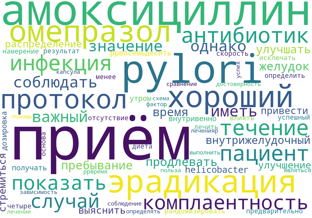 Было показано, что прием амоксициллина после еды не влияет на скорость эрадикации H. pylori ни при анализе результатов на основе намерения лечить [амоксициллин до еды был успешным в 63% случаев (25/40), после — в 65% случаев (26/40)], ни только для тех, кто хорошо соблюдает диету [до еды 81% (17/21), после 71% (20/28)]. Это исключает, с достоверностью 95%, пользу более чем на 18% от приема до или на 23% от приема после еды. Однако было показано, что хорошее соблюдение протокола имеет важное значение: эрадикация H. pylori у 76% (37/49) хорошо соблюдающих протокол пациентов по сравнению с 48% (11/23) других, выполнивших протокол (P <, 0,05).