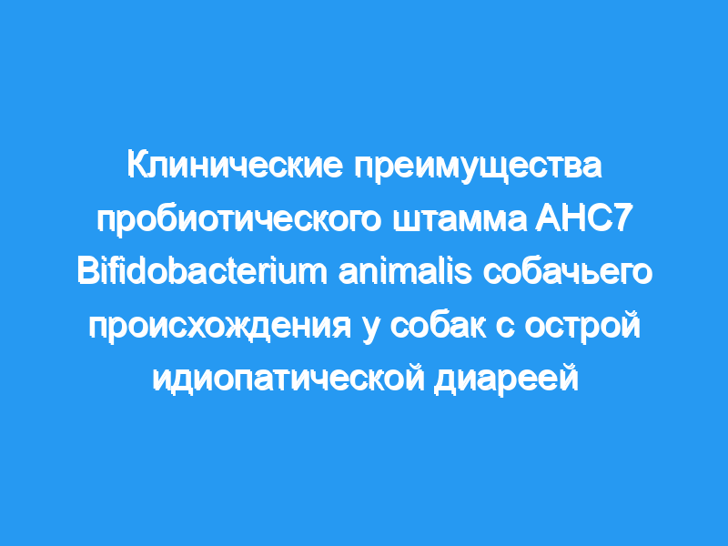 В этом исследовании оценивалось влияние добавок с собачьим пробиотиком Bifidobacterium animalis штамма AHC7 (lams Prostora, Procter & Gamble Pet Care) на скорость разрешения острой идиопатической диареи у собак, которым случайным образом назначили плацебо (n=18) или пробиотик (n=13). Рациональное питание с использованием пробиотика в дозе 2 × 10 (10) КОЕ/сут значительно сократило время до разрешения (3.9 +/- 2.3 против 6.6 +/- 2.7 дней, P <, 0,01) и уменьшил процент собак, которым вводили метронидазол (38,5% против 50,0%) по сравнению с плацебо.