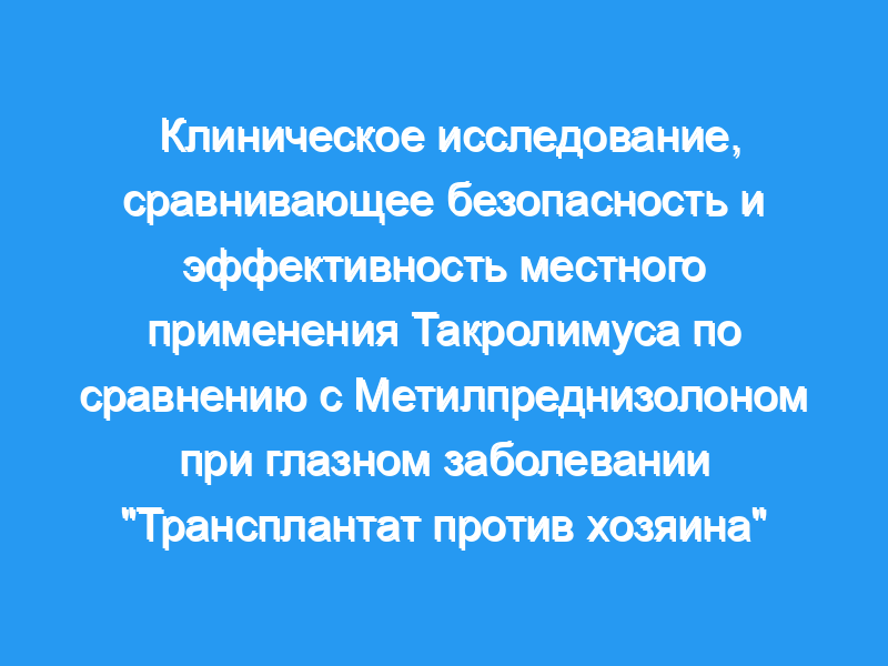 Оценить безопасность и эффективность местного применения такролимуса 0,05% по сравнению с местным применением метилпреднизолона 0,5% у пациентов с глазной болезнью «трансплантат против хозяина» (РТПХ). Дизайн: проспективное рандомизированное клиническое исследование фазы 1/2 с двойной маскировкой. Участники: В исследование были включены восемьдесят глаз 40 пациентов с диагнозом хроническая глазная РТПХ.