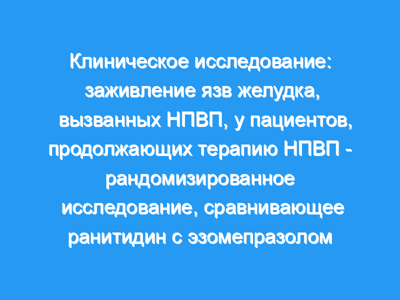 В этом многоцентровом рандомизированном двойном слепом исследовании с параллельными группами сравнивались показатели эндоскопического заживления через 4 и 8 недель после перорального приема эзомепразола в дозе 40 или 20 мг один раз в день или ранитидина в дозе 150 мг два раза в день у пациентов с 1 исходным GU >, or = 5 мм, но без язвы желудка или двенадцатиперстной кишки и более, диаметром 25 мм, которые продолжали получать селективную к циклооксигеназе-2 или неселективную терапию НПВП. Первичным результатом был процент пациентов в каждой группе лечения, у которых не было GUs на 8-й неделе.