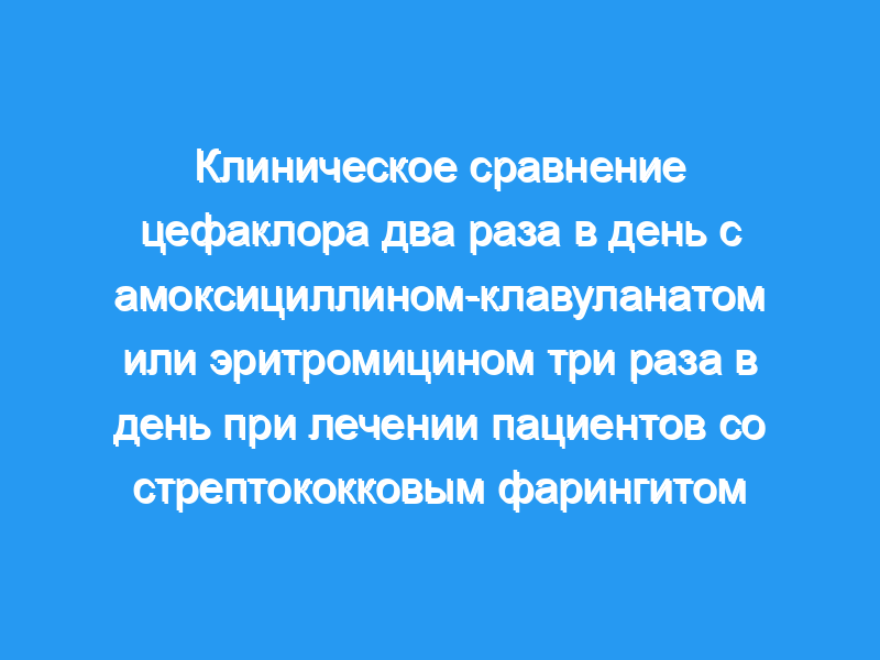 Настоящее исследование было проведено для сравнения эффективности и безопасности нового режима применения цефаклора (25 мг/кг БИД) с амоксициллином-клавуланатом и эритромицином ТИД в стандартных дозах для лечения педиатрических пациентов с острым фаринготонзиллитом (АПТ). В исследование были включены в общей сложности 673 ребенка (возрастной диапазон от 2 до 12 лет) с признаками и симптомами APT, 245 из этих детей, у которых был положительный посев горла на бета-гемолитические стрептококки группы А (GABHS), вошли в исследование и были рандомизированы на получение цефаклора 25 мг/кг BID, амоксициллина- клавуланат 15 мг/кг TID или эритромицин 15 мг/кг TID. Каждому пациенту был назначен 10-дневный курс антибиотиков.