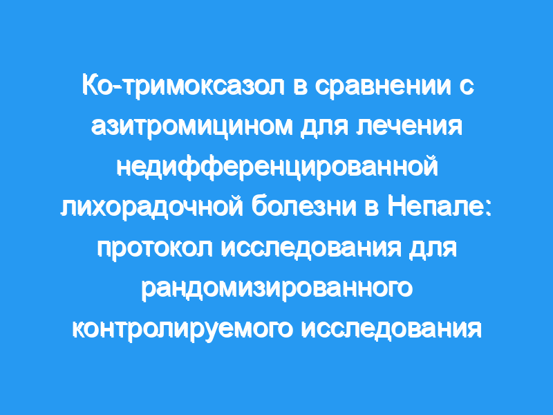 Недифференцированная лихорадочная болезнь (UFI) включает брюшной тиф и сыпной тиф и обычно обозначает лихорадку без каких-либо локализующих признаков. UFI является серьезной терапевтической проблемой в таких странах, как Непал, из-за отсутствия доступных экспресс-диагностических тестов на месте оказания медицинской помощи. Часто пациентов эмпирически лечат как предполагаемую кишечную лихорадку. В связи с развитием высокого уровня резистентности к традиционно используемым фторхинолонам против кишечной лихорадки азитромицин в настоящее время широко используется для лечения кишечной лихорадки/UFI. Возобновление чувствительности Salmonella typhi к ко-тримоксазолу делает его многообещающим пероральным средством для лечения УФИ в целом. Мы представляем протокол рандомизированного контролируемого исследования азитромицина в сравнении с ко-тримоксазолом для лечения UFI. Методы/дизайн: Это двойное слепое рандомизированное контролируемое исследование с параллельными группами, 1:1, с использованием ко-тримоксазола в сравнении с азитромицином для лечения UFI в Непале. Участниками будут пациенты в возрасте от 2 до 65 лет, имеющие лихорадку без четкого очага в течение не менее 4 дней, соответствующие другим критериям исследования и готовые предоставить письменное информированное согласие. Пациенты будут рандомизированы либо на азитромицин 20 мг/кг/сут (максимум 1000 мг/сут) в однократной суточной дозе и идентичное плацебо, либо на ко-тримоксазол 60 мг/кг/сут (максимум 3000 мг/сут) в двух разделенных дозах в течение 7 дней. Пациенты будут наблюдаться с помощью телефонных звонков два раза в день в течение 7 дней или, по крайней мере, в течение 48 часов после того, как у них начнется лихорадка, в зависимости от того, что наступит позже, посещений на дому на 2-й и 4-й дни лечения и посещений больницы на 7, 14, 28 и 63-й дни. Конечными точками будут время клиренса лихорадки, неудача лечения, время до неудачи лечения и нежелательные явления. Предполагаемый размер выборки составляет 330 человек. Первичной популяцией для анализа будет вся рандомизированная популяция, а субанализ будет повторен у пациентов с подтвержденной посевом крови кишечной лихорадкой и пациентов с отрицательным посевом.