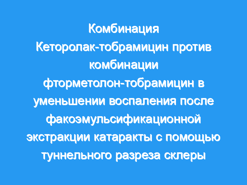 Целью данного исследования было сравнить эффективность комбинации кеторолак-тобрамицин с комбинацией фторметолон-тобрамицин в контроле воспаления глаза после эндокапсулярной факоэмульсификации катаракты с разрезом склерального туннеля. Пациенты и методы: Это было проспективное, рандомизированное, скрытое от исследователей, 2-недельное одноцентровое исследование. Глазные обследования проводились до операции и после операции на 1-й (исходный), 2-й, 3-й, 7-й и 14-й дни. В исследование были включены и рандомизированы 60 пациентов (по 30 в каждой группе лечения), перенесших неосложненную операцию по имплантации катаракты и хрусталика. Исходные параметры были одинаковыми в двух исследуемых группах. При каждом посещении проводилось комплексное обследование глаз и использовалась 4-балльная (от 0 до 3) система оценки для регистрации результатов ощущения жжения/покалывания, затуманенного зрения, дискомфорта в глазах, гиперемии конъюнктивы, воспаления передней камеры и клеток передней камеры.