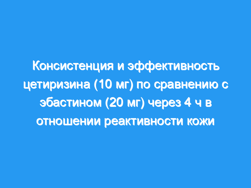 Мы сравнили консистенцию и эффективность двух антигистаминных препаратов, цетиризина (10 мг) и эбастина (20 мг), на гистаминовую реактивность кожи через 4 ч после лечения. Двадцать четыре здоровых добровольца приняли участие в рандомизированном двойном слепом перекрестном исследовании. Площади всплесков и вспышек, вызванных увеличением (0, 5, 10, 50, 100, 200, 300 мг/мл) концентрации гистамина, вводимые с помощью уколовых тестов, измеряли до и через 4 ч после приема цетиризина или эбастина.