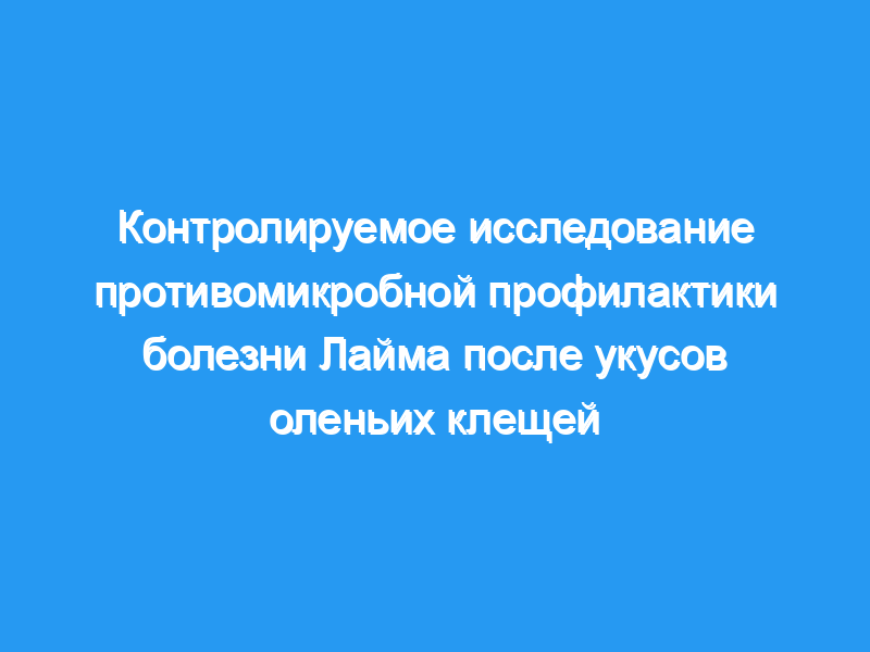 Из 387 испытуемых 205 (53 процента) были назначены на прием амоксициллина и 182 (47 процентов) — на прием плацебо. Из 344 оленьих клещей, представленных и проанализированных с помощью полимеразной цепной реакции, 15 процентов были инфицированы B. burgdorferi. Мигрирующая эритема развилась у двух испытуемых, оба из которых получали плацебо. Не было никаких бессимптомных сероконверсий и никаких поздних проявлений болезни Лайма. Риск заражения B. burgdorferi у пациентов, получавших плацебо, составил 1,2% (95-процентный доверительный интервал от 0,1 до 4,1%), что существенно не отличалось (Р = 0,22) от риска у пациентов, получавших амоксициллин (0%, 95-процентный доверительный интервал от 0 до 1,5%).