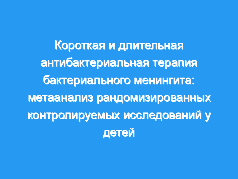Оценить эффективность и безопасность короткого курса антибиотикотерапии бактериального менингита путем проведения мета-анализа рандомизированных контролируемых исследований (РКИ). Методы обзора: PubMed и Cochrane Central Register of Controlled Trials искали РКИ у пациентов всех возрастов с внебольничным острым бактериальным менингитом, в которых сравнивалось лечение одними и теми же антибиотиками в одной и той же суточной дозировке, вводимыми коротким курсом (до 7 дней) по сравнению с более длительным курсом (2 дня или более соответствующего краткого курса).