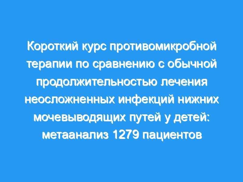 Из 517 ссылок, выявленных с помощью поиска литературы, 37 были отобраны для подробного обзора, а 22 были включены в окончательный мета-анализ. Общая разница в показателях излечения между короткими и традиционными курсами терапии была значительной (6,38%, 95% ДИ: 1,88% -10,89%), что свидетельствует в пользу традиционного курса. Аналогичные результаты были получены, когда были включены только исследования, сравнивающие одни и те же препараты в коротких и обычных курсах (7,92%, 95% ДИ: от 2,09% до 13,8%). Короткий курс амоксициллина уступал обычному длительному курсу (разница в скорости излечения 13%, 95% ДИ: от 4% до 24%), не было обнаружено разницы между коротким курсом и обычным длительным курсом триметоприм-сульфаметоксазола (разница в скорости излечения 6,24%, 95% ДИ = -3,74% до 16,2%).