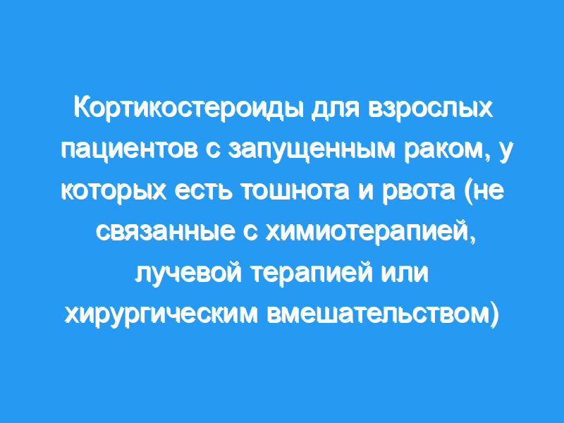 Оценить влияние кортикостероидов на тошноту и рвоту, не связанные с химиотерапией, лучевой терапией или хирургическим вмешательством у взрослых онкологических больных. Методы поиска: Мы искали CENTRAL, MEDLINE Ovid, Embase Ovid, CINAHL EBSCO, Science Citation Index Web of Science, Latin America and Caribbean Health Sciences (LILACS), Conference Proceedings Citation Index — Science Web of Science и реестры клинических испытаний с момента создания по 23 августа 2016 года. Критерии отбора: Любое двойное слепое рандомизированное или проспективное контролируемое исследование, в котором участвовали взрослые в возрасте 18 лет и старше с запущенным раком с тошнотой и рвотой, не связанными с химиотерапией, лучевой терапией или хирургическим вмешательством, имело право на обзор при использовании кортикостероидов в качестве противорвотного лечения. Сбор и анализ данных: Все авторы обзора независимо оценивали качество исследования и извлекали данные. Мы использовали среднее арифметическое и стандартные отклонения для каждого результата, чтобы сообщить о средней разнице (MD) с 95% доверительным интервалом (ДИ). Мы оценили качество доказательств с помощью GRADE и создали таблицу «Краткое изложение результатов».