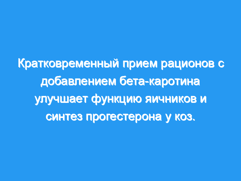 Коз (n = 22, 34 месяца) случайным образом распределили в одну из двух экспериментальных групп: (i) бета-каротин [Бета, n = 10, масса тела (BW = 44.8 +/- 1.45 кг), оценка состояния тела (BCS = 3,25 +/- 0,07)], и (ii) Контроль (Контроль, n = 12, BW = 45.30 +/- 1.32 кг, БКС = 3.33 +/- 0.06 ). После синхронизации эструса бета-группа получала 50 мг бета-каротина в день в течение 35 дней до и 17 дней после овуляции.