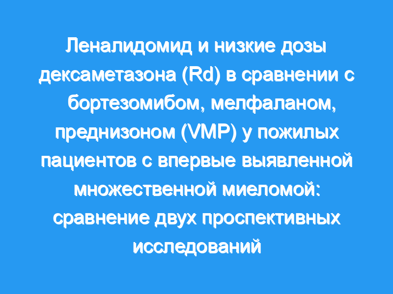 В настоящее время нет прямых прямых клинических испытаний, оценивающих бортезомиб-мелфалан-преднизон (VMP) в сравнении с леналидомидом и дексаметазоном в низких дозах (Rd). Группы VMP (257 случаев) и Rd (222 случая) двух рандомизированных исследований III фазы были использованы для оценки влияния лечения на исход у нелеченных пожилых пациентов с ММ.