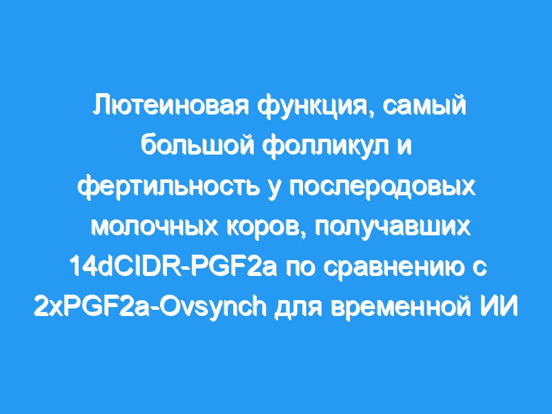 14-дневная обработка CIDR представляет собой метод предварительной синхронизации, который гарантирует, что крупный рогатый скот находится в поздней лютеиновой фазе эстрального цикла, когда PGF2a вводят перед своевременной ИИ. Целью этого исследования было проверить эффективность программы 14dCIDR-PGF2a у послеродовых молочных коров путем сравнения ее с традиционной программой «Предсинхрон-Овсинхрон» (2xPGF2a-Ovsynch).