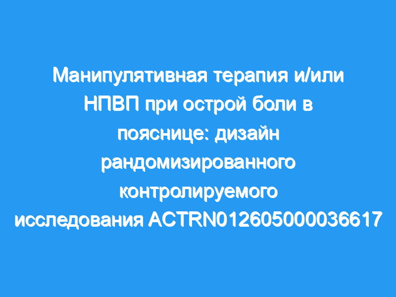 Острая боль в пояснице — распространенное заболевание, приводящее к боли и инвалидности. Действующие национальные и международные рекомендации рекомендуют лечение у врача общей практики, включая консультации и парацетамол (4 г в день у здоровых взрослых) в качестве первой линии помощи людям с острой болью в пояснице. Нестероидные противовоспалительные препараты (НПВП) и спинальная манипулятивная терапия (СМТ) рекомендуются во многих рекомендациях в качестве вариантов лечения второй линии для пациентов с острой болью в пояснице, которые не выздоравливают. Ни в одном исследовании не изучалась роль НПВП и/или СМТ в дополнение к лечению первой линии при острой боли в пояснице. Основная цель этого исследования — выяснить, приводят ли НПВП и/или СМТ в дополнение к рекомендациям врача общей практики и парацетамолу к сокращению времени восстановления у пациентов с острой болью в пояснице. Вторичные цели исследования — оценить, влияет ли добавление SMT и/или НПВП на боль, инвалидность и общий воспринимаемый эффект через 1, 2, 4 и 12 недель после начала терапии у пациентов со значительной острой болью в пояснице. Методы/дизайн: В этом документе представлены обоснование и дизайн рандомизированного контролируемого исследования, в котором изучалось добавление НПВП и/или СМТ у 240 человек, которые обратились к своему врачу общей практики со значительными острыми болями в пояснице.