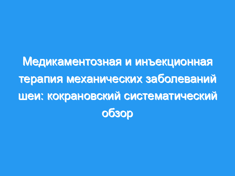 Тридцать два отобранных исследования имели общее методологическое качество в среднем 3,2/5. При острой хлыстовой травме внутривенное введение метилпреднизолона в течение 8 часов уменьшало боль на одну неделю [SMD -0,90 (95% ДИ от -1,57 до -0,24)] и отпуск по болезни, но не боль через 6 месяцев по сравнению с плацебо. При хроническом МНД при краткосрочном наблюдении внутримышечная инъекция лидокаина превосходила плацебо [SMD 1,36 (95% ДИ от -1,93 до -0,80)]. При хроническом МНД с обнаружением радикулита эпидуральное введение метилпреднизолона и лидокаина уменьшало боль в шее [SMD -1,46 (95% ДИ от -2,16 до -0,76)] и улучшало функцию при годичном наблюдении по сравнению с внутримышечным введением. При подостром/хроническом МНД мы обнаружили противоречивые данные о применении пероральных психотропных средств. При хроническом МНД с обнаружением радикулита или головной боли или без них в 5 высококачественных исследованиях были получены умеренные данные, показывающие, что внутримышечные инъекции ботулинического токсина (ботокса А) не лучше, чем физиологический раствор, в улучшении боли [SMD в совокупности -0,39 (95% ДИ -1,25 — 0,47)], инвалидности или глобального воспринимаемого эффекта.