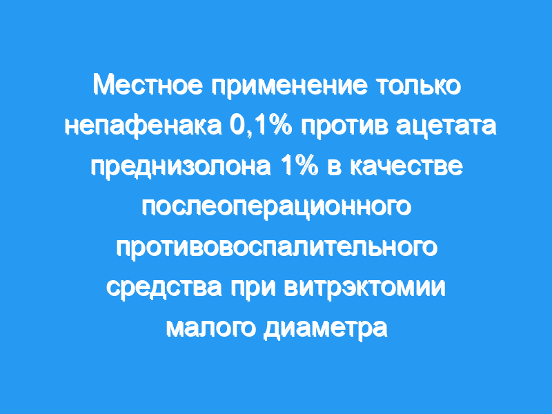 В исследование были включены восемьдесят глаз 76 пациентов, перенесших витрэктомию малого калибра. Пациенты, которые соответствовали критериям включения, были рандомизированы для местного применения только непафенака (группа 1) или только ацетата преднизолона (группа 2) для использования в качестве послеоперационных противовоспалительных средств. Испытуемые были обследованы на 1-й, 30-й и 90-й дни. Воспаление глаз и придатков было соответствующим образом классифицировано с использованием стандартизированной классификации. Оценка глазной боли проводилась по Визуальной аналоговой шкале (ВАШ). Статистический анализ: Использовался критерий ранговой суммы Уилкоксона с использованием двустороннего анализа.