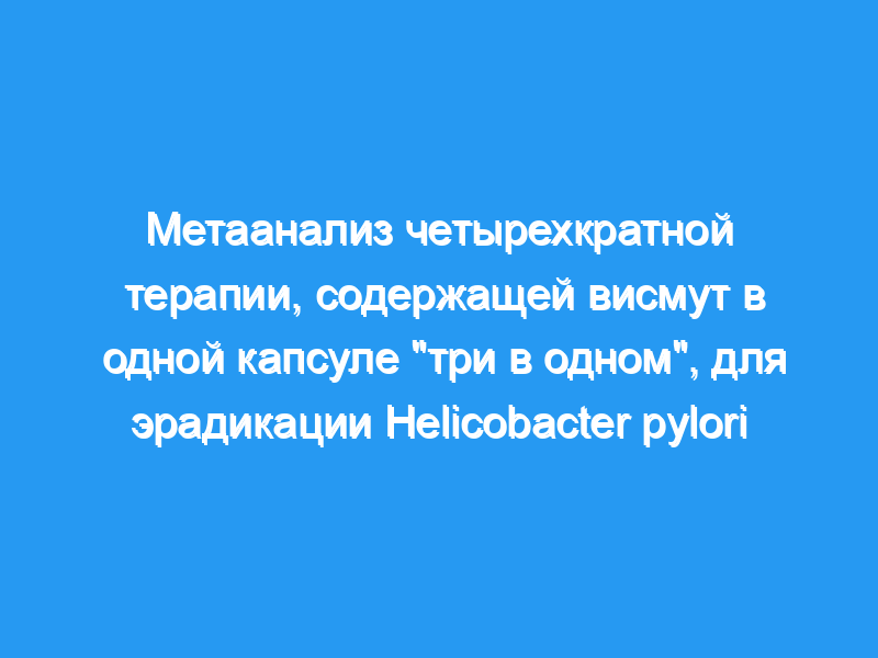 Четырехкратная терапия, содержащая висмут, была предложена в качестве первой линии и спасительной альтернативы для эрадикации Helicobacter pylori. Нашей целью было провести метаанализ, оценивающий эффективность и безопасность однокапсульного препарата Пилера® (висмут, метронидазол и тетрациклин) в сочетании с ингибитором протонной помпы (ИПП) в любой линии лечения.