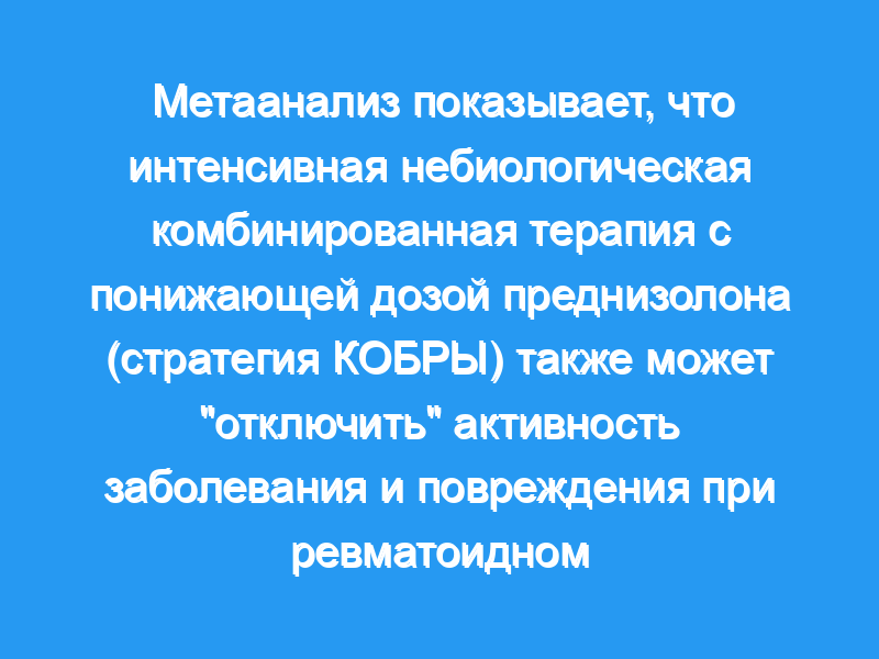 Предпосылки/цель: Лечение ревматоидного артрита (РА) антагонистами фактора некроза опухоли (TNF) изменяет взаимосвязь между активностью заболевания и прогрессированием рентгенологического повреждения суставов («разъединение»): у пациентов, у которых активность заболевания незначительна или отсутствует вообще, все еще наблюдается снижение прогрессирования повреждения. При раннем РА стратегия COBRA (комбинация метотрексата и сульфасалазина с понижающим преднизолоном), как было показано, эквивалентна высокой дозе метотрексата и инфликсимаба в подавлении прогрессирования повреждения (BeSt trial). Мы исследовали, может ли лечение КОБРОЙ также «отключить» активность болезни и ущерб. Дизайн: Метаанализ объединил данные исследования COBRA (COBRA против монотерапии сульфасалазином) с данными двух групп исследования BeSt (COBRA против последовательной монотерапии). Линейная регрессия связала 1-летнее прогрессирование повреждения (оценка Sharp van der Heijde) в качестве зависимой переменной с активностью заболевания (усредненный по времени показатель активности заболевания в 44 суставах (DAS44) или С-реактивный белок (CRP)), стратегией лечения (COBRA или контроль) и их взаимодействием (показатель A disconnect) в качестве независимых переменных. Основным результатом был объединенный срок взаимодействия.
