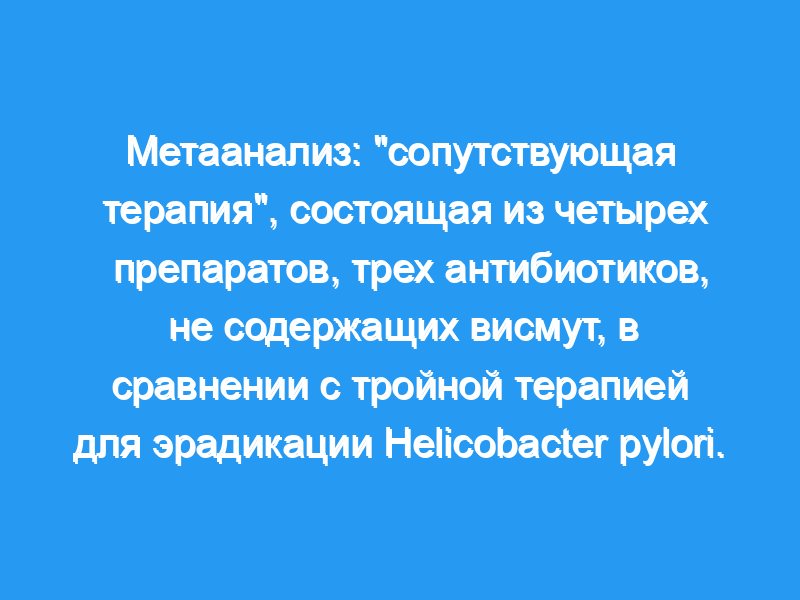 Путем поиска в PubMed, EMBASE, Кокрейновском центральном реестре контролируемых исследований и тезисах основных желудочно-кишечных совещаний два независимых рецензента систематически идентифицировали рандомизированные контролируемые исследования (РКИ), сравнивающие сопутствующую четырехкратную и стандартную тройную терапию, а также исследования, в которых сообщалось о показателях эрадикации сопутствующей четырехкратной терапии при лечении H. пилори. Были рассчитаны объединенные показатели эрадикации и коэффициенты шансов (OR) с 95% доверительными интервалами (ДИ), и был проведен однофакторный метарегрессионный анализ для всех извлеченных переменных.