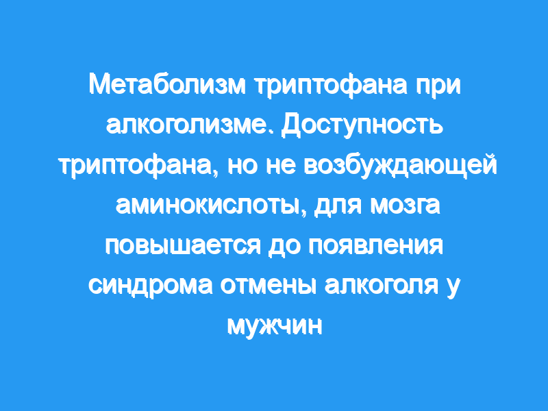 Метаболизм и распределение триптофана (Trp), а также концентрации возбуждающих и других аминокислот были определены у зависимых от алкоголя субъектов в связи с синдромом отмены алкоголя (AWS). Параметры были исследованы у 12 зависимых от алкоголя мужчин, перенесших плановую резекцию опухоли верхних отделов пищеварительного тракта, и у 12 контрольных лиц, соответствующих возрасту, полу и медикаментозному лечению, в трех случаях: до операции, после операции и непосредственно перед (т.е. в течение 24 ч of) внешний вид AWS. В первом или втором из этих случаев не наблюдалось существенных различий между контрольной группой и испытуемыми, употребляющими алкоголь.