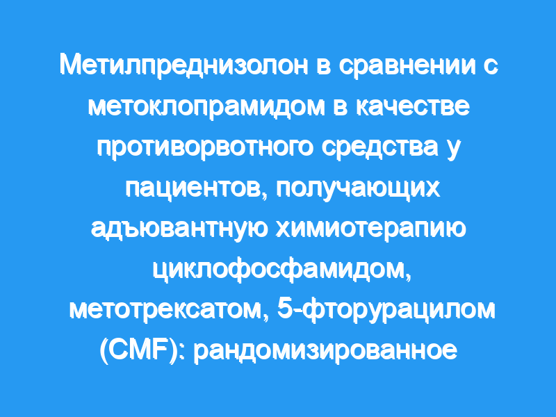 Девятнадцать женщин, получавших свой первый цикл адъювантной химиотерапии по поводу раннего рака молочной железы, были рандомизированы между двумя противорвотными препаратами: метилпреднизолоном (MPN) 125 мг и метоклопрамидом (MCP) 20 мг, оба вводились внутривенно в виде однократной дозы.