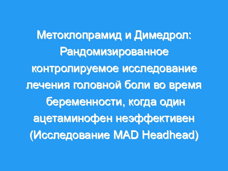 Мы исследовали, снимает ли метоклопрамид, вводимый с димедролом (MAD), головную боль у беременных женщин, когда один ацетаминофен неэффективен, используя кодеин для сравнения. План исследования: Нормотензивные беременные женщины во втором или третьем триместре были рандомизированы для внутривенного введения MAD (10 мг и 25 мг соответственно) или кодеина перорально (30 мг) от головной боли после того, как от 650 до 1000 мг ацетаминофена не смогли облегчить их головные боли. Тяжесть головной боли (оценка боли 0-10 баллов) отмечалась с интервалом в 24 часа. Первичным результатом было снижение болевого синдрома через 6 часов после приема препарата. Расчет размера выборки из 35 пациентов в каждой группе был основан на оценочном снижении показателя головной боли по крайней мере на два балла, с α 0,05 и степенью 80%.