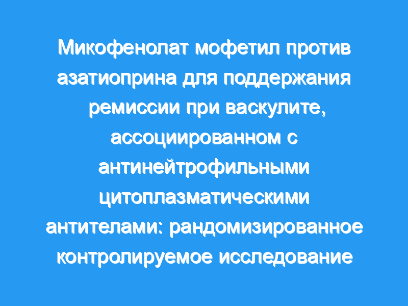 Сравнить эффекты микофенолата мофетила с азатиоприном на профилактику рецидивов у пациентов с AAV. Дизайн, организация и участники: Открытое рандомизированное контролируемое исследование, Международный протокол микофенолата Мофетила для уменьшения вспышек васкулита (IMPROVE), для проверки гипотезы о том, что микофенолат мофетил более эффективен, чем азатиоприн, для предотвращения рецидивов при AAV. Исследование проводилось в 42 центрах в 11 европейских странах в период с апреля 2002 года по январь 2009 года (42-месячное исследование). Подходящие пациенты имели недавно диагностированный AAV (гранулематоз Вегенера или микроскопический полиангиит) и были в возрасте от 18 до 75 лет на момент постановки диагноза. Вмешательства: Пациенты были рандомизированы на азатиоприн (начиная с 2 мг/кг/сут) или микофенолат мофетил (начиная с 2000 мг/сут) после индукции ремиссии циклофосфамидом и преднизолоном. Основные итоговые показатели: Первичной конечной точкой была безрецидивная выживаемость, которая оценивалась с использованием модели пропорциональных рисков Кокса. Вторичными конечными точками были Индекс повреждения при васкулите, расчетная скорость клубочковой фильтрации и протеинурия.