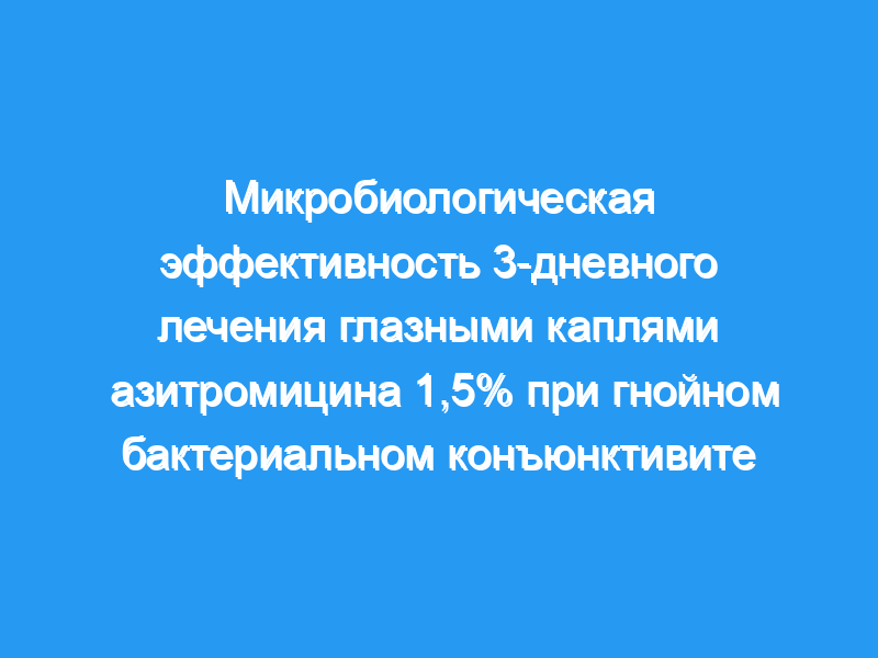 В целом, местная терапия азитромицином 1,5%, вводимая только два раза в день в течение 3 дней, эффективно уничтожает большинство патогенных бактерий, связанных с бактериальным конъюнктивитом. Эти микробиологические результаты соответствуют наблюдаемому клиническому исходу. Это новое противоинфекционное средство обладает преимуществом короткого курса лечения, который может привести к улучшению комплаентности пациентов.