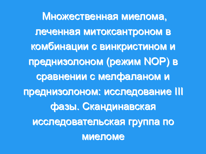 Сто пятьдесят один пациент с ранее нелеченной множественной миеломой был направлен на лечение либо по схеме NOP (митоксантрон 16 мг/м2 и винкристин 2 мг в 1-й день и преднизолон 250 мг в 1-4 и 17-20-й дни), либо по схеме M+P (мелфалан 0,25 мг/кг и преднизолон 100-200 мг/сут 1-4-й день). Обе схемы повторялись каждые 4 недели и были запланированы на 1 год.