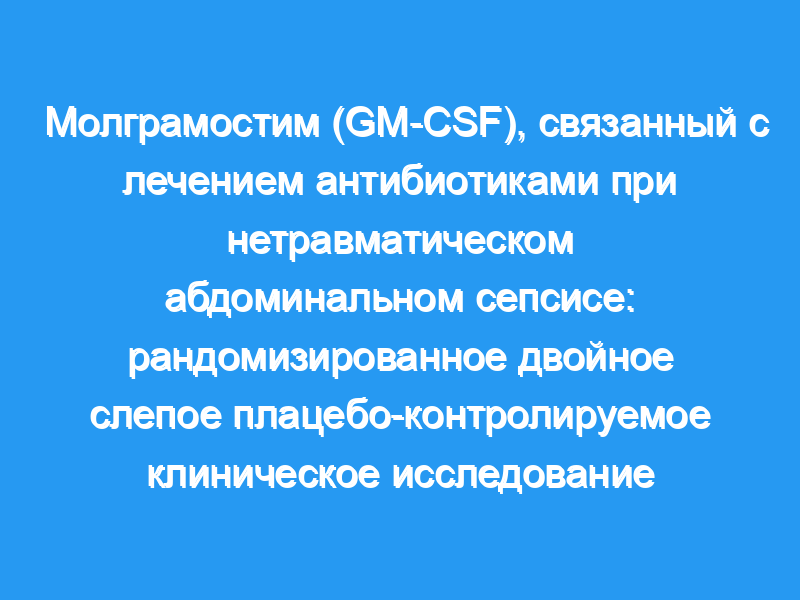 Третичный реферальный центр. Пациенты: Пятьдесят восемь пациентов с абдоминальным сепсисом. Вмешательства: Пациенты были распределены на прием, в дополнение к цефтриаксону натрия, амикацину сульфату и метронидазолу, молграмостима в суточной дозе 3 мкг/кг в течение 4 дней (группа 1) или плацебо (группа 2). Антибиотики назначались в течение не менее 5 дней и прекращались после того, как наступало клиническое улучшение и количество лейкоцитов было нормальным в течение 48 часов. Основные показатели результатов: время до улучшения, продолжительность антибактериальной терапии, пребывание в больнице, осложнения, смертность и побочные реакции на лекарства.