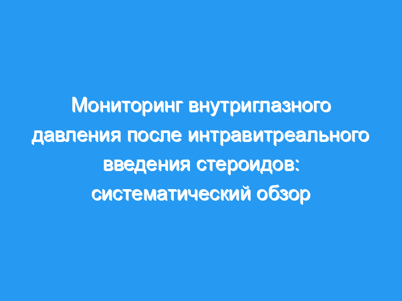 Мы предлагаем протокол мониторинга ВГД после инъекции / имплантации стероидов IVT, который включает проверку ВГД в течение 30 минут после инъекции, а затем через 1 неделю после внутривенного введения триамцинолона и через 2 недели после установки имплантата, затем каждые 2 недели в течение первого месяца и ежемесячно в течение 6 месяцев после имплантации внутривенного введения триамцинолона и дексаметазона и через 9 месяцев после имплантации флуоцинолона.