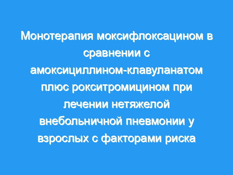 Целью данного исследования была оценка эффективности и безопасности моксифлоксацина в сравнении с амоксициллином-клавуланатом плюс рокситромицином (аналог) у взрослых пациентов с внебольничной пневмонией (ВП) с фактором риска.