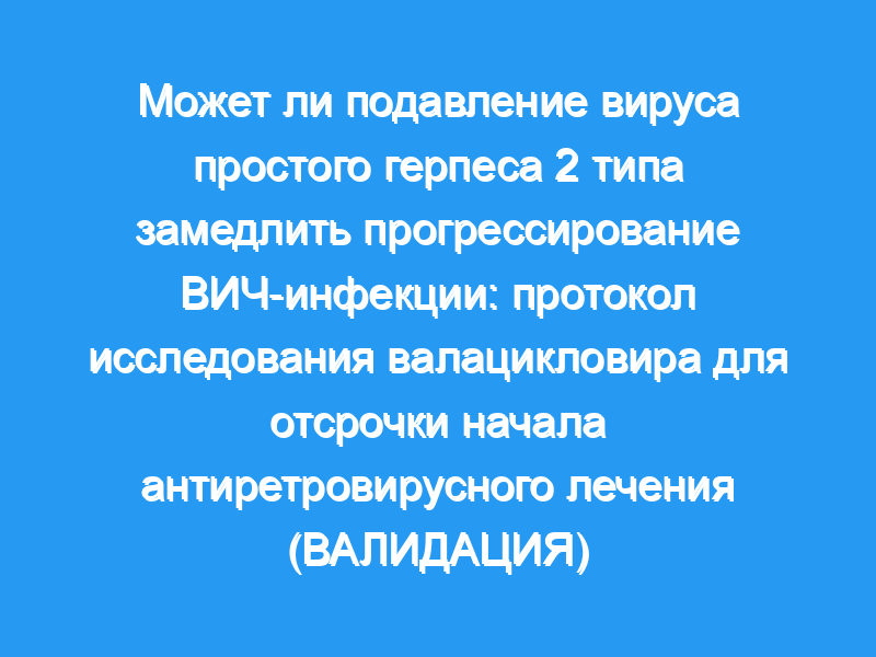 Хотя высокоактивная антиретровирусная терапия (ВААРТ) значительно снизила заболеваемость и смертность, связанные с ВИЧ, связанные с этим затраты, токсичность и риски резистентности делают потенциальную задержку начала ВААРТ привлекательной целью. Подавление вируса простого герпеса 2-го типа (ВПГ-2) может быть новой стратегией для достижения этой цели, поскольку ВПГ-2 связан с клинически значимым увеличением вирусной нагрузки ВИЧ, основной движущей силой прогрессирования заболевания ВИЧ. Методы/дизайн: Исследование «ВАЛацикловир в отсрочке начала антиретровирусной терапии» (VALIDATE) представляет собой многоцентровое, рандомизированное, полностью слепое клиническое исследование валацикловира в дозе 500 мг два раза в день по сравнению с плацебо для отсрочки необходимости начала ВААРТ среди ВИЧ-1, ВПГ-2 коинфицированных взрослых, не получавших ВААРТ. 480 участников из Канады, Бразилии и Аргентины будут проходить ежеквартальное клиническое наблюдение до достижения комбинированной первичной конечной точки — количества CD4+ Т-клеток ≤ 350 клеток/мм (3) или начала ВААРТ по любой причине, в зависимости от того, что произойдет раньше. В первичном анализе будет использоваться модель пропорциональных рисков, стратифицированная по участку, для оценки относительного риска прогрессирования до этой конечной точки, связанного с валацикловиром. Во вторичных анализах сравниваются темпы изменения количества CD4, медиана log10 вирусной нагрузки ВИЧ, побочные эффекты, связанные с приемом лекарств, частота реактиваций ВПГ, частота ВПГ, резистентного к ацикловиру, и качество жизни между группами исследования.