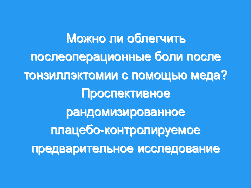 Учреждение третичной медицинской помощи в Анкаре, Турция. Пациенты: Шестьдесят последовательных пациентов с тонзиллэктомией, рандомизированных на две группы. Вмешательства: Группу, получавшую ацетаминофен, лечили антибиотиками (амоксициллин-клавулоновая кислота), ацетаминофеном и плацебо, группу, получавшую ацетаминофен плюс мед, лечили антибиотиками (амоксициллин-клавулоновая кислота), ацетаминофеном и медом. Визуальная аналоговая шкала (ВАШ) применялась для субъективной оценки послеоперационных болей, в то время как количество принимаемых ежедневно обезболивающих и пробуждение ночью из-за боли использовались для объективной оценки. Степень эпителизации использовалась для оценки восстановления миндалины. Итоговые показатели: Разница между группами, принимавшими ацетаминофен и ацетаминофен плюс мед, была статистически значимой как по ВАШ, так и по количеству обезболивающих, принятых в течение первых 2 послеоперационных дней (p<,0,001). Хотя не было статистически значимой разницы между группами в отношении показателей ВАШ на 3-й послеоперационный день и после, количество принимаемых обезболивающих значительно различалось до 8-го послеоперационного дня (p<,0,001 для первых 7 послеоперационных дней, p=0,003 для 8-го дня). Не было обнаружено существенной разницы между группами в отношении количества пробуждений ночью (р=0,36). Эпителизация миндалин была более быстрой в группе ацетаминофен плюс мед (p<,0,001).