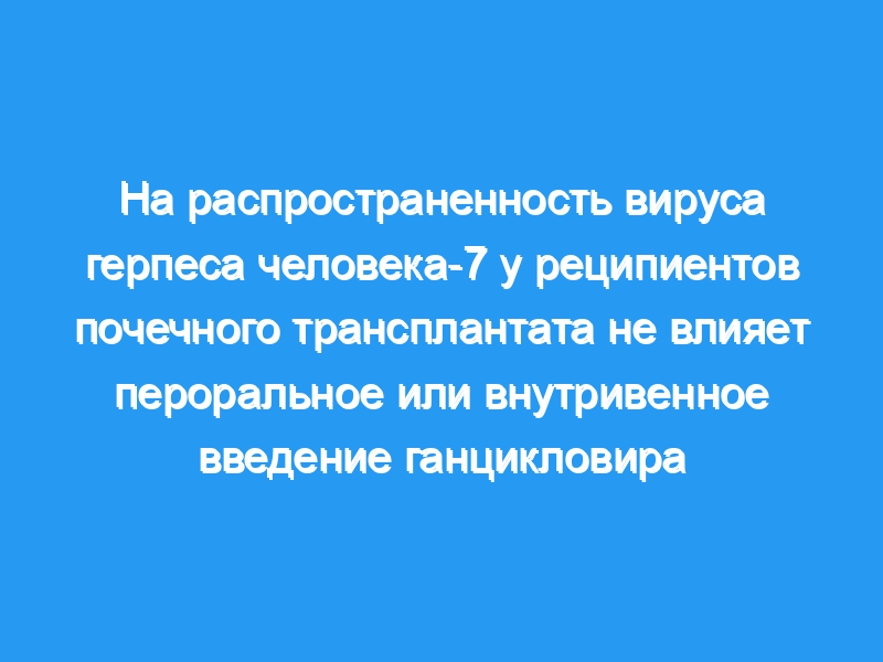 Целью этого исследования было сравнить распространенность вирусной герпесвирусной (ВГЧ)-7 и цитомегаловирусной (ЦМВ) виремии человека и эффекты перорального и внутривенного (в/в) ганцикловира у реципиентов почечного трансплантата с риском заражения ЦМВ. Сохраненные лизаты лейкоцитов периферической крови 92 пациентов, у которых ранее был проведен анализ на ЦМВ-виремию методом полимеразной цепной реакции (ПЦР) в течение 12 недель после трансплантации, были проанализированы на наличие ВГВ-7-виремии.