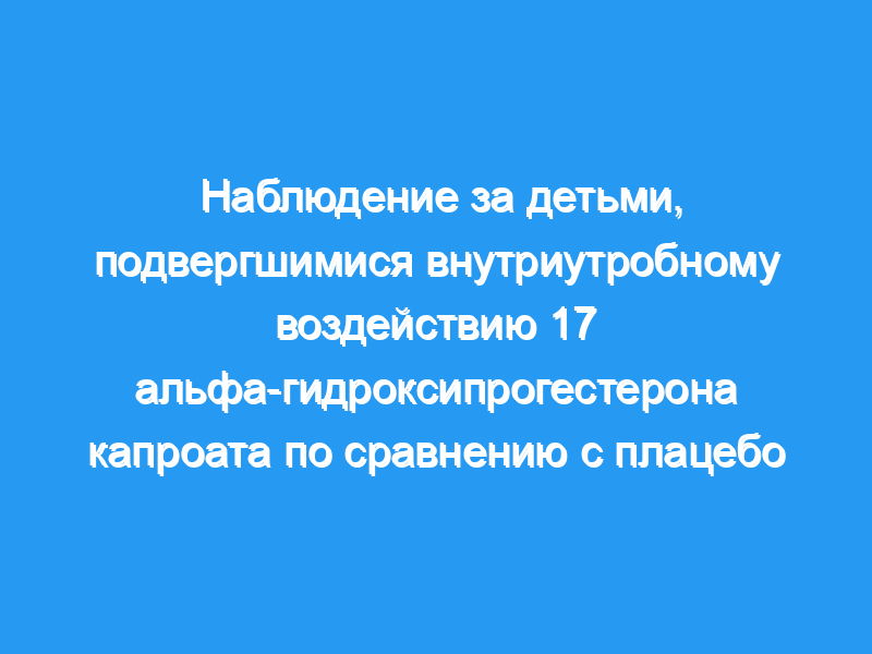 Из 348 подходящих выживших детей 278 (80%) были доступны для оценки (194 в группе 17 альфа-гидроксипрогестерона капроата и 84 в группе плацебо). Средний возраст наблюдения составил 48 месяцев. Не было обнаружено существенных различий в состоянии здоровья или физикальном обследовании, включая аномалии гениталий, между 17 детьми, получавшими альфа-гидроксипрогестерон капроат, и детьми, получавшими плацебо. Баллы для гендерных ролей (Перечень мероприятий в дошкольном учреждении) были в пределах нормы и аналогичны между группами 17 альфа-гидроксипрогестерона капроата и плацебо.
