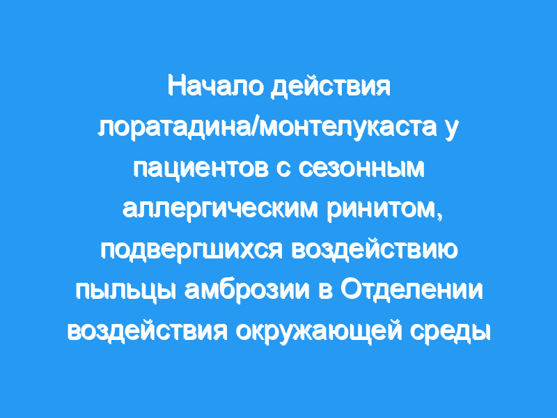 Это исследование было разработано для оценки начала действия лоратадина/монтелукаста (В/М, 10 мг/10 мг) по сравнению с плацебо у пациентов с сезонным АР (САР), вызванным амброзией. В Отделении воздействия окружающей среды (EEU) было проведено одноцентровое двойное слепое параллельное групповое исследование пациентов с АР, чувствительных к амброзии (n = 310). Субъекты подвергались воздействию пыльцы амброзии в ЕАЭС, и симптомы регистрировались за 30, 60, 90 и 120 минут до однократного приема L/M или плацебо.