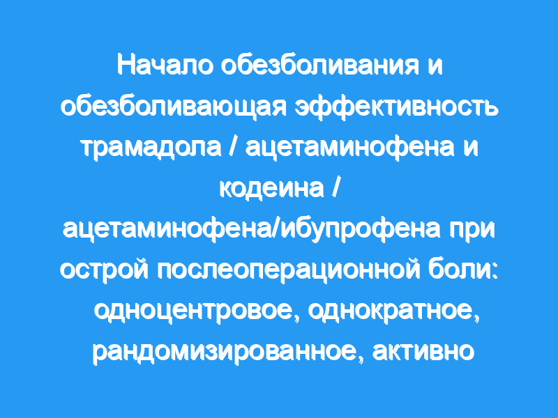 Целью этого исследования было сравнить время до начала анальгезии и другие показатели обезболивающей эффективности трамадола/ацетаминофена 75/650 мг (Tr/Ac) и кодеина/ацетаминофена/ибупрофена 20/500/400 мг (Co/Ac/Ib) при лечении острой боли после челюстно-лицевая хирургия.