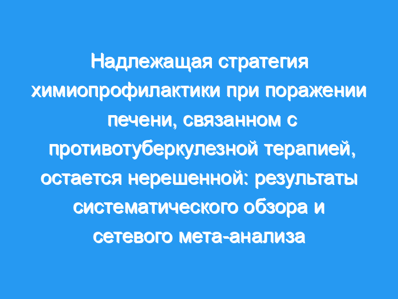 Было выявлено четырнадцать исследований, и семь из них были включены в мета-анализ. Агентами, используемыми для профилактики АТТ-ДИЛИ, были силимарин/силибинин (4 испытания), N-ацетилцистеин (NAC) (3 исследования), растительные препараты (5 исследований) и по одному исследованию на холекальциферол и карнитин. По сравнению с контрольной группой/плацебо вероятность возникновения гепатотоксичности при применении НАК составила 7* 10-17 (95% CrI: 2,8 * 10-53, 0,0053), а силимарина — 0,68 (95% CrI: 0,084, 4,6). NAC имел самую высокую вероятность ранга 1 (0,99), за которым следовал Силимарин (0,004).