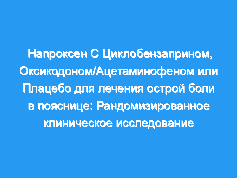 Сравнить функциональные исходы и боль через 1 неделю и 3 месяца после посещения ЭД по поводу острого ЛБП среди пациентов, рандомизированных на 10-дневный курс (1) напроксен + плацебо, (2) напроксен + циклобензаприн или (3) напроксен + оксикодон/ацетаминофен. Дизайн, обстановка и участники: Это рандомизированное двойное слепое 3-групповое исследование было проведено в одном городском центре в Бронксе, Нью-Йорк. Пациенты, у которых был нетравматический, нерадикулярный LBP продолжительностью 2 недели или менее, имели право на зачисление после выписки из ED, если они набрали более 5 баллов по опроснику инвалидности Роланда-Морриса (RMDQ). RMDQ — это вопросник из 24 пунктов, обычно используемый для измерения LBP и связанных с ним функциональных нарушений, в котором 0 указывает на отсутствие функциональных нарушений, а 24 указывает на максимальное нарушение. Начиная с апреля 2012 года, в общей сложности было зарегистрировано 2588 пациентов. Из 323 человек, признанных годными к участию, 107 были рандомизированы для получения плацебо и по 108 — для циклобензаприна и оксикодона/ацетаминофена. Последующее наблюдение было завершено в декабре 2014 года. Вмешательства: Всем участникам было дано 20 таблеток напроксена по 500 мг для приема два раза в день. Они были рандомизированы для получения либо 60 таблеток плацебо, циклобензаприна, 5 мг, либо оксикодона, 5 мг/ацетаминофена, 325 мг. Участникам было поручено принимать 1 или 2 из этих таблеток каждые 8 часов, по мере необходимости для LBP. Они также прошли стандартную 10-минутную образовательную сессию LBP перед выпиской. Основные результаты и меры: Первичным результатом было улучшение RMDQ между выпиской из ЭД и 1 неделей спустя.