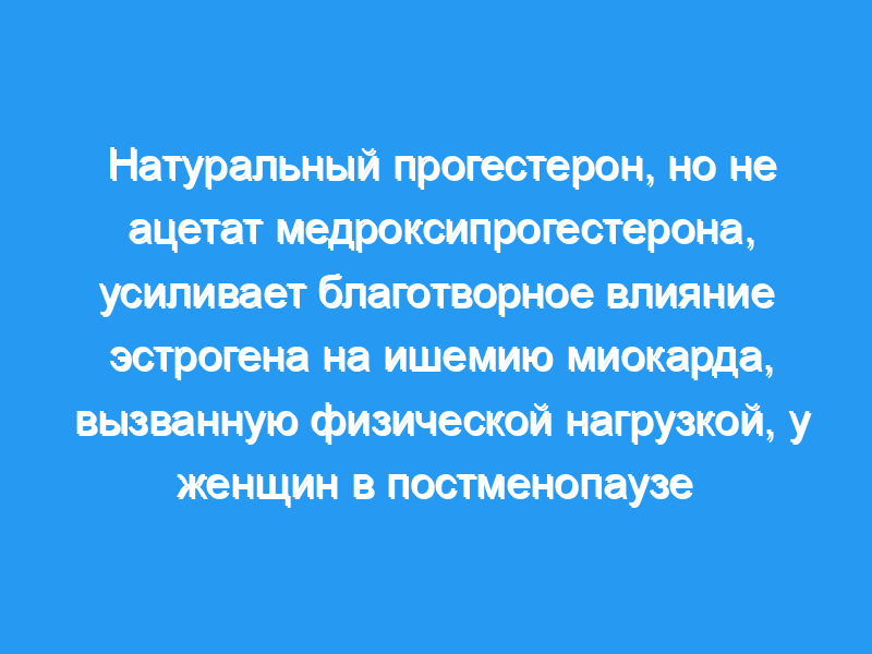 Терапия эстрогенами благотворно влияет на ишемию миокарда, вызванную физической нагрузкой, у женщин в постменопаузе, однако женщины с интактной маткой также принимают прогестин для защиты от злокачественных новообразований матки. Влияние комбинированной терапии эстрогенами и прогестинами на ишемию миокарда неизвестно. Восемнадцать женщин в постменопаузе (средний возраст +/- SD 59+/-7 лет) получали 17-бета-эстрадиол в однократном слепом режиме в течение четырех недель (1 мг/сут в течение трех недель, затем 2 мг/сут в течение одной недели). Затем продолжался прием эстрадиола (2 мг/сут), и пациенты были рандомизированы (двойное слепое исследование) на 12 дней либо на трансвагинальный прогестероновый гель (90 мг поочередно), либо на пероральное МПА-плацебо (10 мг/сут), либо наоборот. Еще через две недели приема только эстрадиола пациенты перешли на лечение прогестином и повторили протокол с противоположным лечением. Пациенты проходили тестирование на беговой дорожке после каждой фазы приема эстрадиола и на 10-й день каждой фазы приема прогестина.