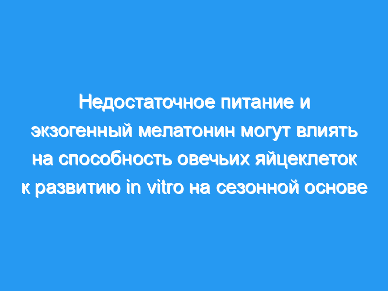 В этом исследовании оценивалось влияние экзогенного мелатонина и уровня питания на жизнеспособность яйцеклеток, экстракорпоральное оплодотворение (ЭКО) и раннее эмбриональное развитие у овец во время сезонного аноэструса (SA) и репродуктивного сезона (RS). Взрослые овцы породы Раса Арагонеса были случайным образом распределены в одну из четырех групп лечения в двух экспериментах, основанных на факторном расчете 2 х 2 х 2.
