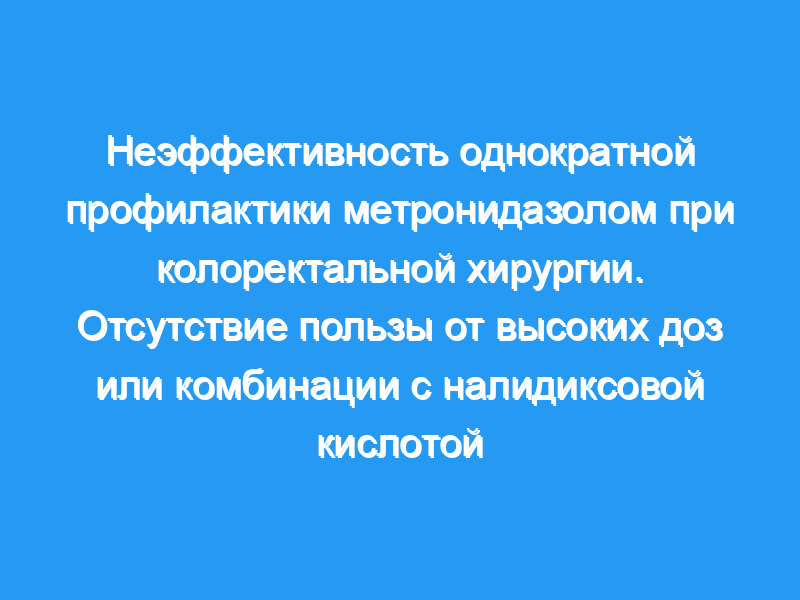 В открытом проспективном исследовании послеоперационных инфекционных осложнений пациенты, перенесшие плановую операцию на прямой кишке, были случайным образом распределены в одну из трех групп, получавших парентеральную однократную противомикробную профилактику (1 г или 3 г метронидазола или 1 г метронидазола + 3 г налидиксовой кислоты). Из-за неприемлемо высокого уровня хирургической инфекции во всех трех группах (36%, 29% и 39%, р более 0,1) среди первых 103 обследованных пациентов исследование было прекращено.