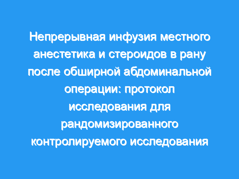 Воспалительная реакция является одним из ключевых компонентов восприятия боли. Было показано, что непрерывная инфузия (CWI) местных анестетиков эффективна в борьбе с болью и снижении послеоперационного потребления морфина, но эффект добавления мощного противовоспалительного препарата (такого как стероид) никогда не рассматривался. В нашем исследовании мы хотим исследовать влияние CWI с местным анестетиком + метилпреднизолоном на острую и постоянную боль, сопоставляя клинические данные с биомаркерами воспаления и генетическим фоном. Методы/дизайн: После одобрения их институциональным наблюдательным советом три больницы зарегистрируют 120 пациентов, перенесших серьезную абдоминальную операцию, в рандомизированном двойном слепом исследовании III фазы. После 24-часового CWI ропивакаин 0,2 % + метилпреднизолон 1 мг/кг пациенты будут случайным образом распределены на прием либо ропивакаин + стероид, либо плацебо в течение следующих 24 часов. Затем планируется контролируемая пациентом CWI только с ропивакаином 0,2 % или плацебо (в зависимости от группы рандомизации) через 48 ч до 7 дней (болюс 10 мл, блокировка 1 ч, максимальная доза 40 мл через 4 ч). Будет проанализировано потребление эквивалента морфина в течение 7 дней вместе с любым побочным эффектом, связанным с катетером или лекарством. Также будет исследована частота стойкой послеоперационной боли (PPSP). Нашей первичной конечной точкой является потребление анальгетиков в первые 7 дней после операции, в качестве вторичных конечных точек мы будем оценивать любой побочный эффект, связанный с катетером или лекарством, корреляции генотипа / фенотипа между некоторыми полиморфизмами и послеоперационным исходом с точки зрения потребления морфина, развития воспалительной реакции и частоты PPSP. Наконец, мы будем собирать в подгруппе пациентов образцы раневого экссудата с помощью микродиализа, образцы крови и образцы мочи в течение 72 ч для исследования местного и системного воспаления и окислительного стресса.