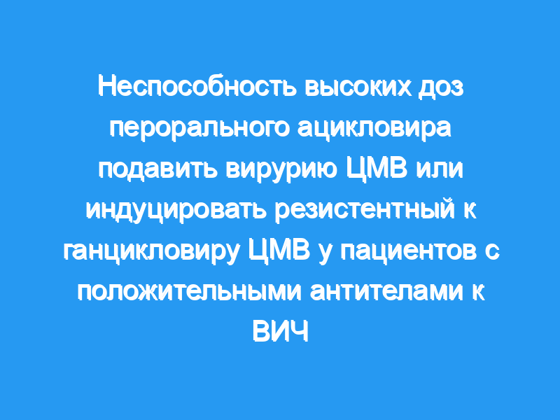 Процент образцов мочи, положительных на ЦМВ, составил 7,1% в группе ZDV и 5,8% в группе ZDV плюс ACV (p = 0,55), у 27% пациентов был по крайней мере один посев мочи, положительный на ЦМВ, в то время как принимавших ZDV, по сравнению с 20% пациентов, принимавших комбинацию ZDV плюс ACV (р = 0,52). Мы пришли к выводу, что ACV в дозе 4800 мг/сут не подавляет экскрецию ЦМВ с мочой у пациентов с симптомами ВИЧ-положительных антител, принимающих одновременно ZDV. Применение ACV, по-видимому, не вызывало резистентности ЦМВ к ганцикловиру, поскольку ID50 изолятов из двух групп лечения не различались.