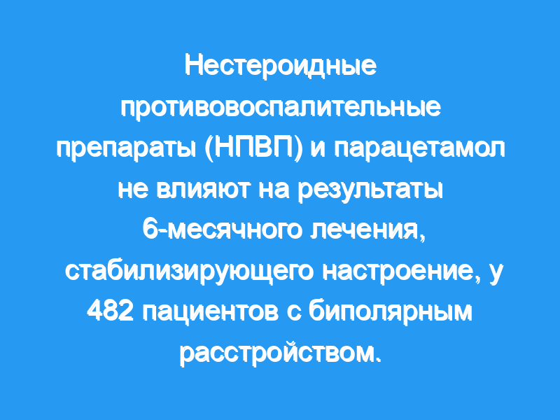Это первое исследование, показавшее что применение НПВП и парацетамола, отдельно или в комбинации, не влияет на результаты лечения биполярного расстройства, стабилизирующего настроение, на основе лития или кветиапина. Предыдущие исследования показали, что НПВП могут препятствовать лечению антидепрессантами, в то время как наши результаты подтверждают выводы, указывающие на отсутствие вредного воздействия НПВП или парацетамола на лечение аффективных расстройств.
