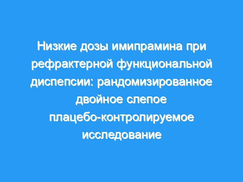 В это одноцентровое двойное слепое рандомизированное контролируемое исследование мы включили последовательно пациентов с функциональной диспепсией Rome II в возрасте 18-80 лет. Подходящие пациенты были отрицательными по Helicobacter pylori, имели нормальную эндоскопию верхних отделов желудочно-кишечного тракта и ультразвуковое исследование брюшной полости, и у них сохранялись симптомы после открытого лечения 8 недель эзомепразолом и 4 недели домперидоном. Пациенты заполняли анкеты, оценивающие симптомы диспепсии, настроение и бессонницу, а затем были случайным образом распределены (1:1) с помощью сгенерированного компьютером списка случайных чисел на прием имипрамина (в дозе 25 мг один раз в сутки в течение первых 2 недель, а затем 50 мг после этого) или плацебо в течение 12 недель. Первичной конечной точкой было общее удовлетворительное облегчение глобальных симптомов диспепсии через 12 недель с помощью оценки, о которой сообщили пациенты в популяции, намеревающейся лечиться. Это испытание зарегистрировано в ClinicalTrials.gov , номер NCT00164775, и завершено. Результаты: В период с 11 сентября 2005 года по 20 августа 2010 года 107 пациентов с рефрактерной к лечению функциональной диспепсией были рандомизированы для получения имипрамина (n=55) или плацебо (n=52). Облегчение глобальных симптомов диспепсии через 12 недель произошло у 35 (63·6%, 95% ДИ 50·4-75·1 ) из 55 пациентов, получавших имипрамин, по сравнению с 19 (36·5%, 95% ДИ 24·8-50·1 ) из 52, получавших плацебо (р=0·0051). Десять (18%) пациентов, получавших имипрамин, прекратили исследование из-за побочных эффектов (три сухости во рту, два запора, две сонливости и по одному бессоннице, учащенному сердцебиению и ухудшению зрения), по сравнению с четырьмя (8%) пациентами, получавшими плацебо (одна сухость во рту и запор, и по одному учащенному сердцебиению, ухудшение желудочно-пищеводного рефлюкса и парестезии конечностей). Серьезных побочных эффектов не наблюдалось. Интерпретация: Низкие дозы имипрамина следует рассматривать в качестве возможной терапии для пациентов с функциональной диспепсией, рефрактерной как к ИПП, так и к прокинетикам, хотя пациентов следует предупредить о профиле побочных эффектов. Финансирование: Отсутствует.