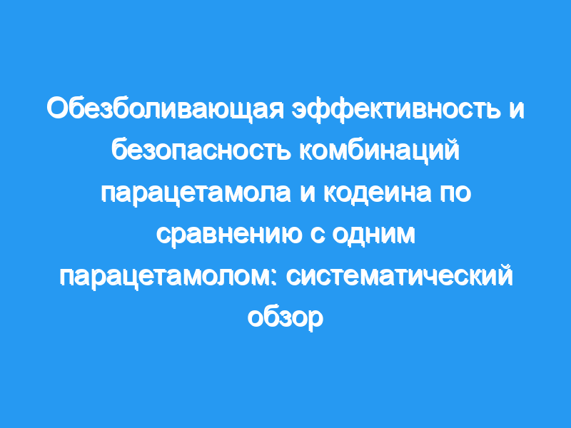 Оценить, оказывает ли добавление кодеина к парацетамолу дополнительный обезболивающий эффект, оценить безопасность комбинаций парацетамол-кодеин по сравнению с одним парацетамолом. Дизайн: Систематический обзор литературы с метаанализом, методологическое качество опубликованных исследований оценивается с помощью 13 предопределенных критериев. Испытания: 24 из 29 испытаний, которые соответствовали критериям включения. Моделями, изученными в испытаниях, были послеоперационная боль (21), послеродовая боль (одна), боль при остеоартрите (одна) и экспериментально вызванная боль (одна). Вмешательства: Дозы варьировались от 400 до 1000 мг парацетамола и от 10 до 60 мг кодеина. Основные итоговые показатели: Суммарная разница в интенсивности боли (анализ эффективности) и доля пациентов, сообщивших о побочном эффекте (анализ безопасности).